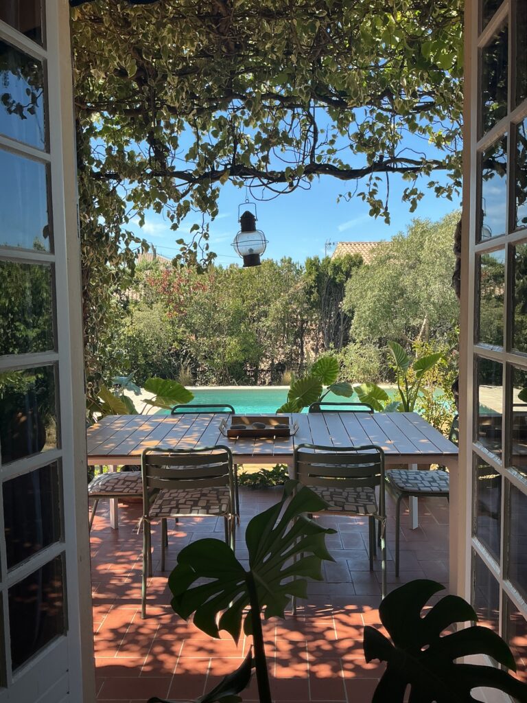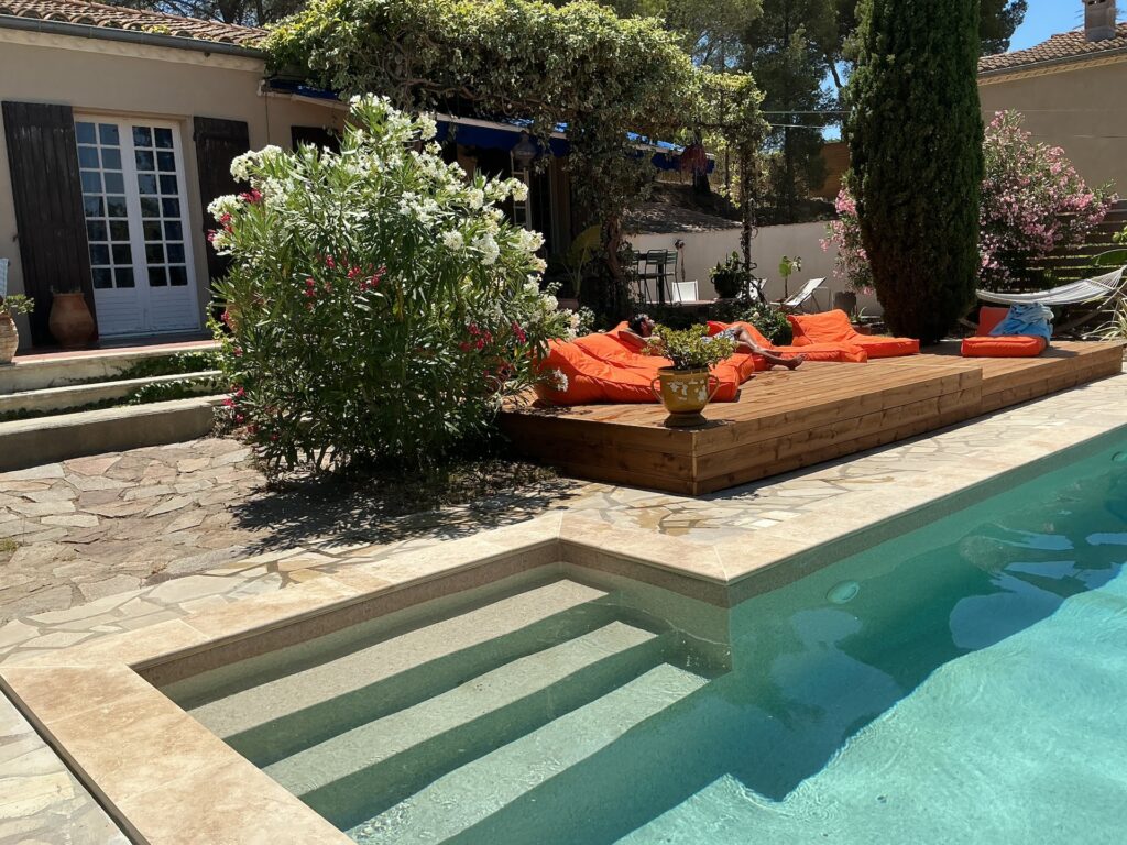 le tout ouvert sur une vaste terrasse ombragée avec vue directe sur la piscine.
