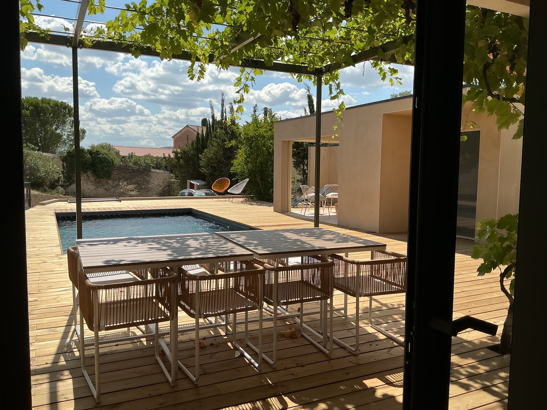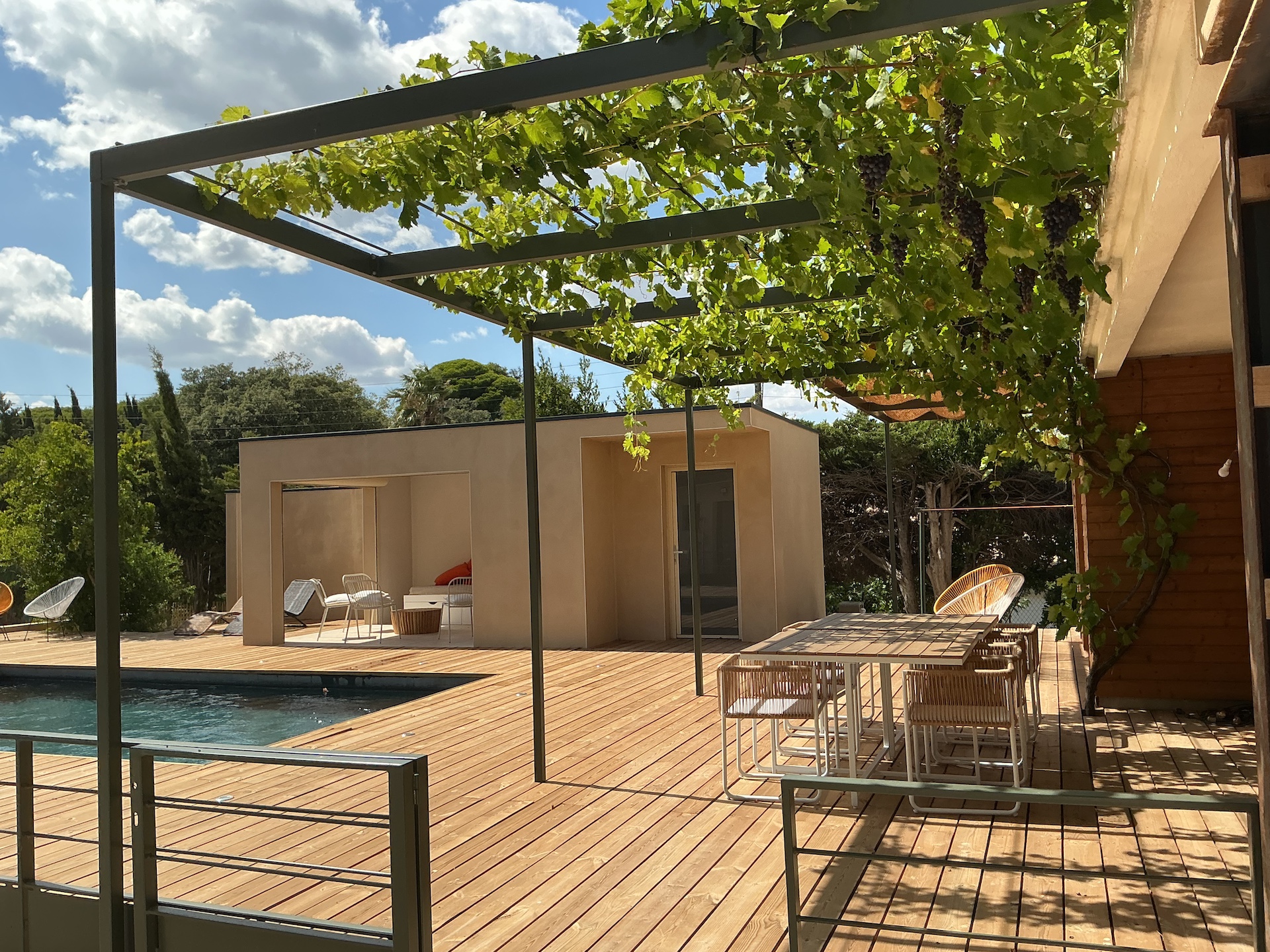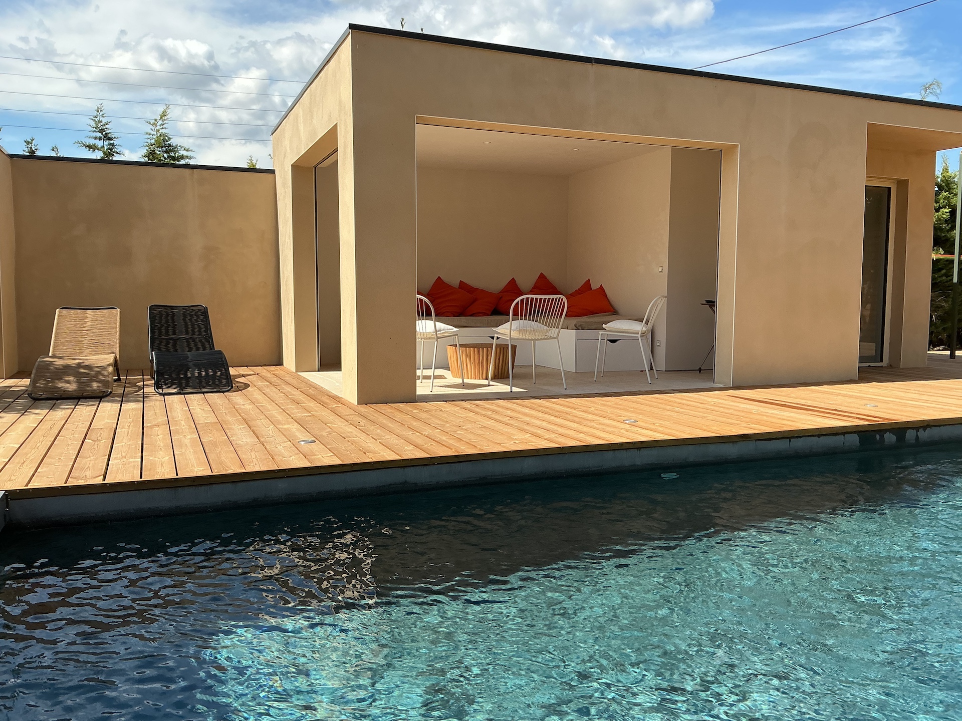 Extérieur : terrasses en bois avec solarium, pool-house aménagé, piscine au sel, jardin clôturé, plancha, boulodrome, baby-foot et parking privé (3 voitures avec station de recharge)