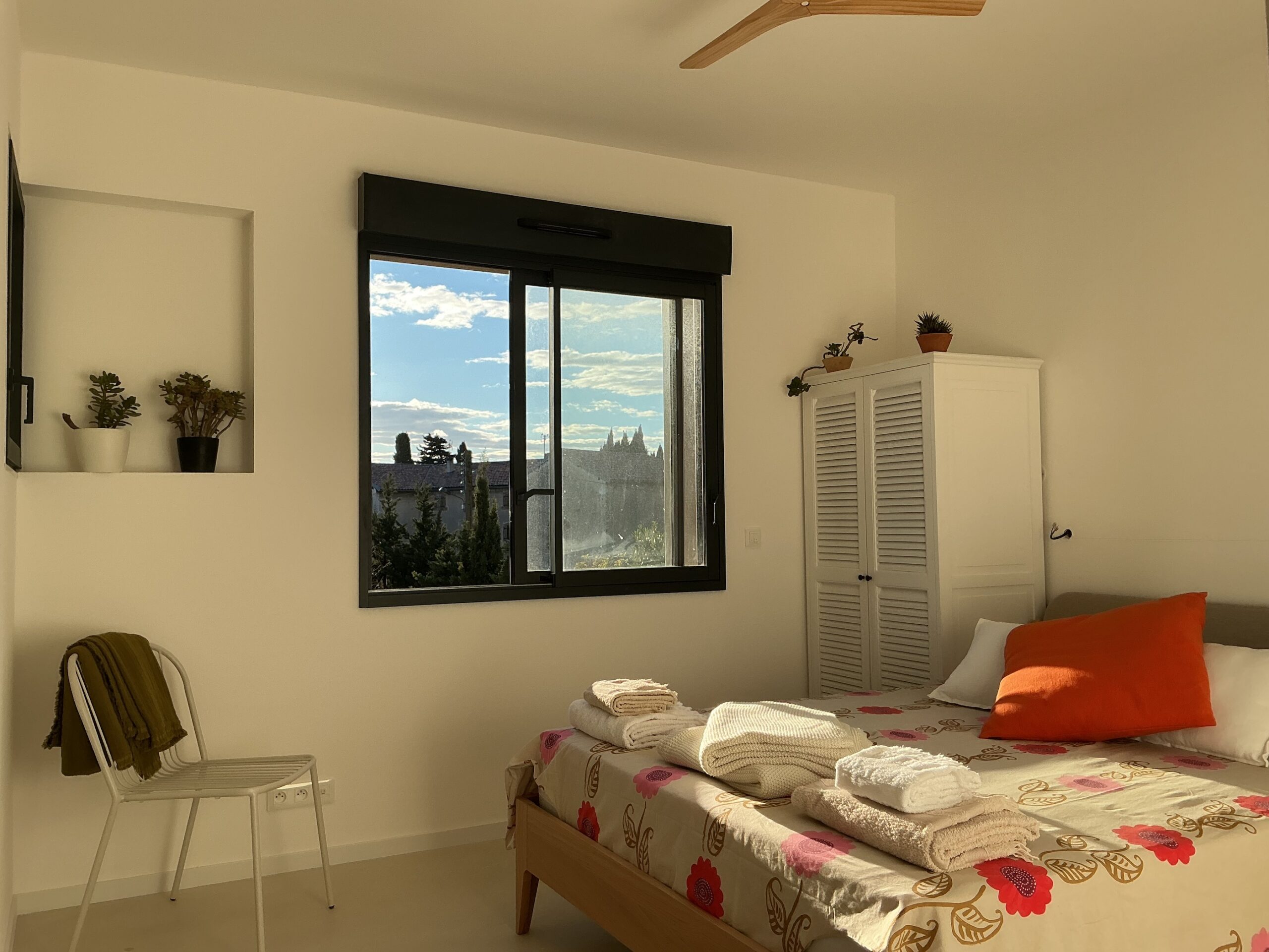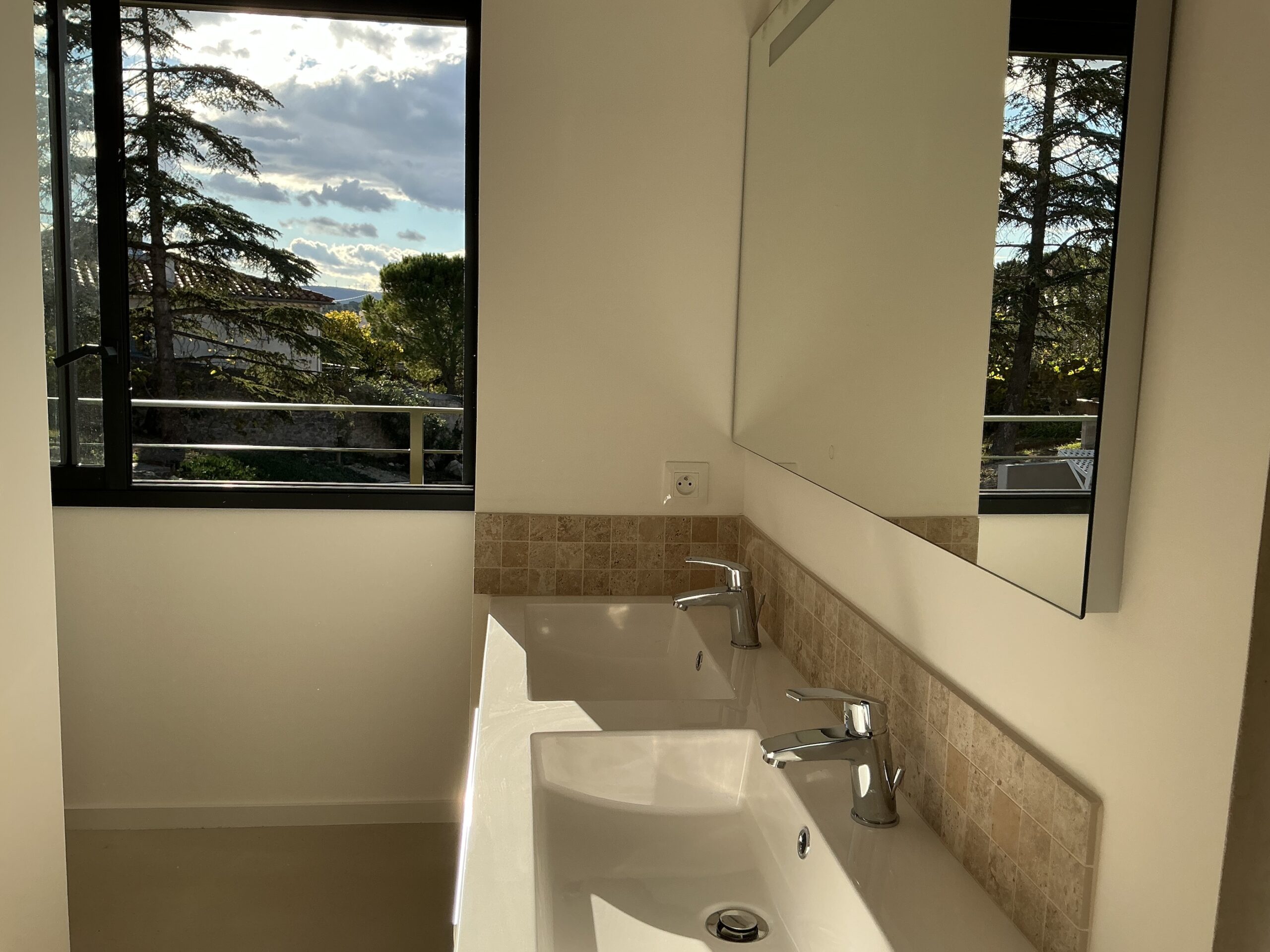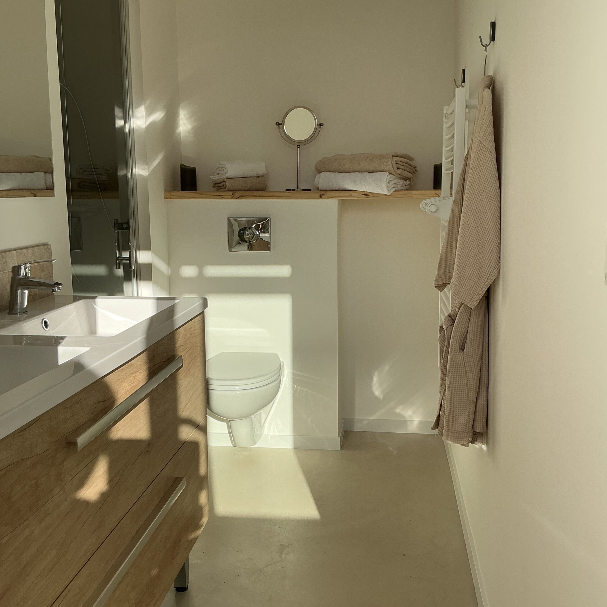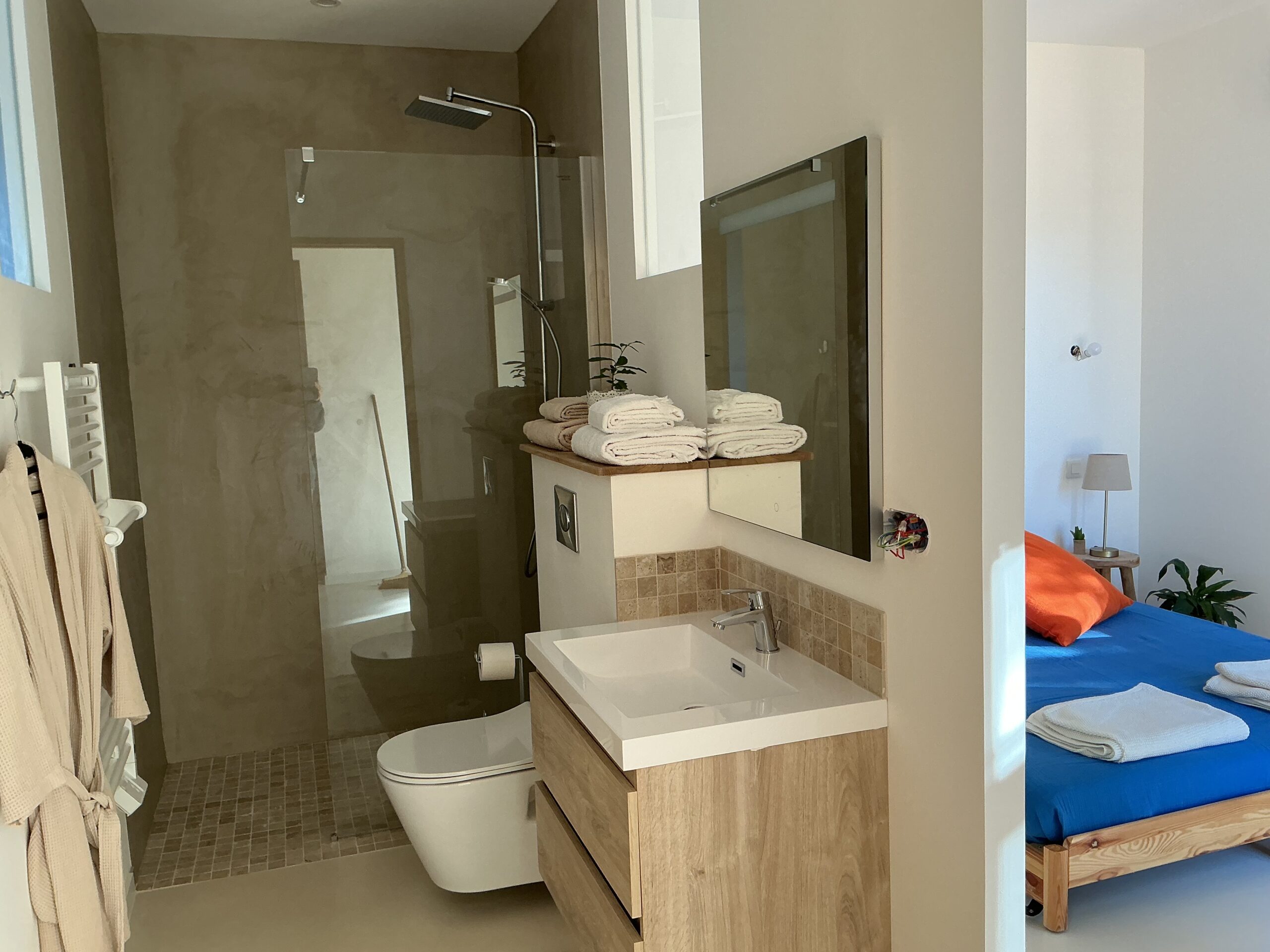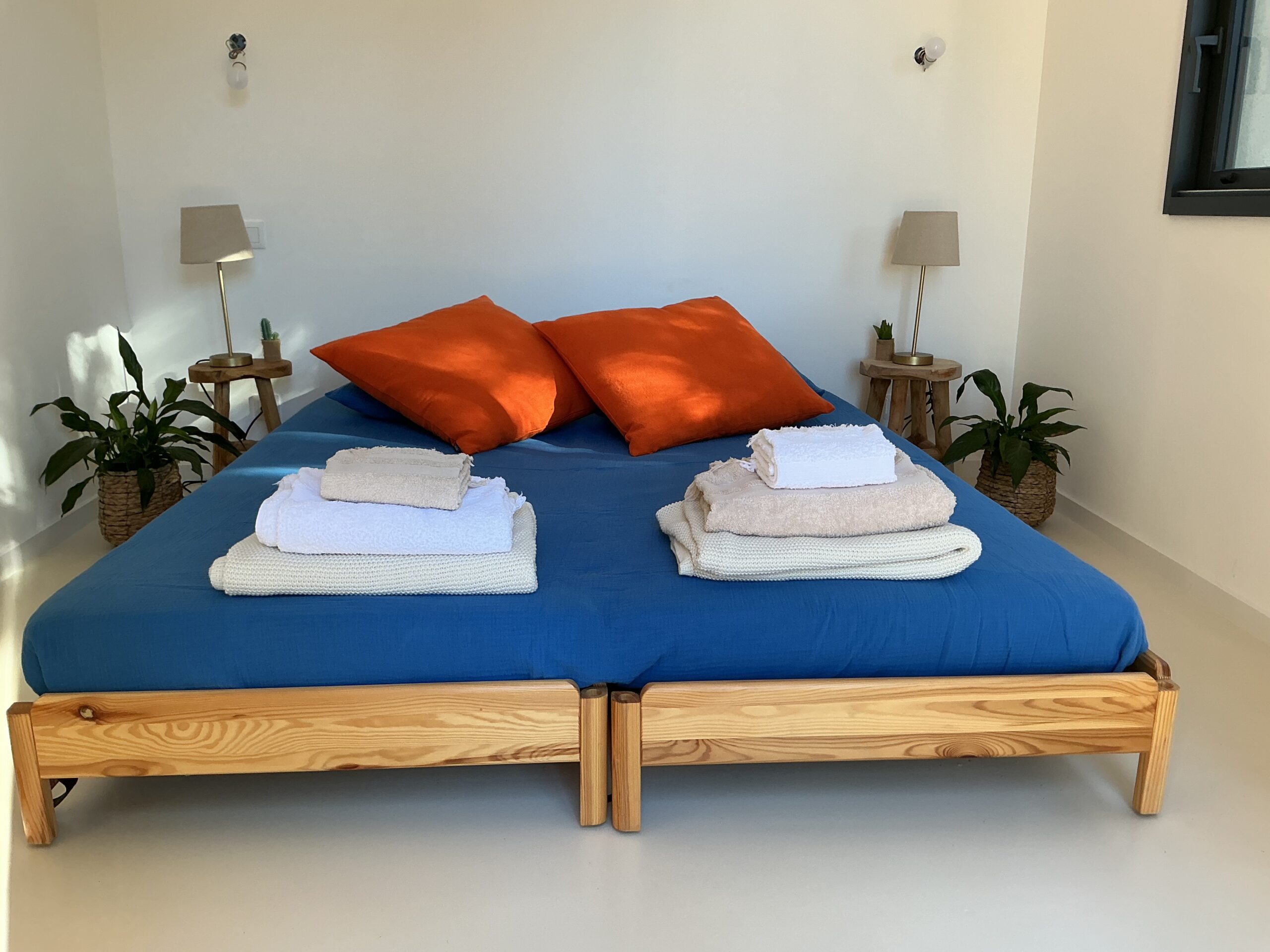 À l’étage : deux chambres doubles avec salle d’eau et WC, une chambre double avec terrasse privée, et une suite familiale composée de deux chambres (4 lits 90×190 modulables en lits doubles) avec salle d’eau, WC et terrasse.